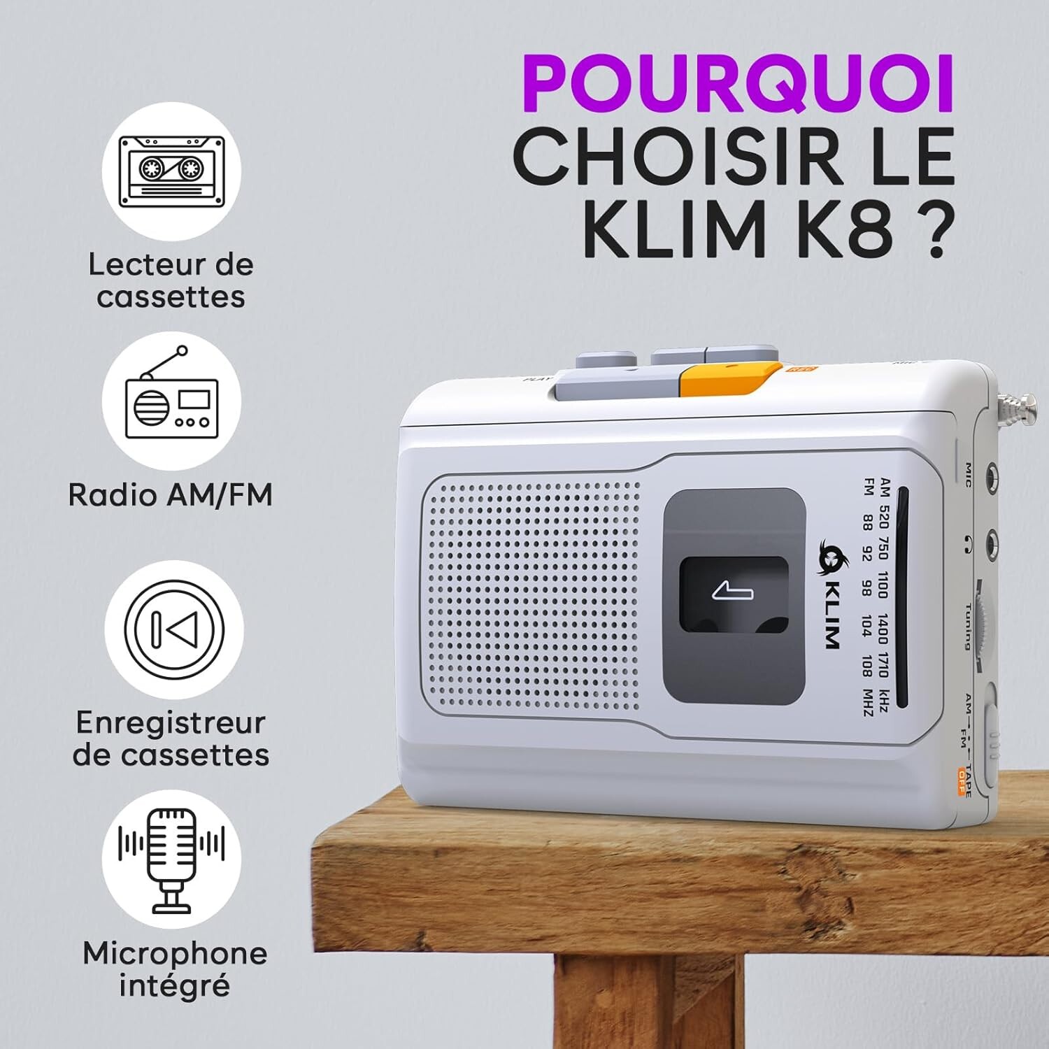 Le KLIM K8 est un lecteur de cassettes compact conçu pour profiter de vos enregistrements audio en toute simplicité. Il permet la lecture de cassettes classiques ainsi que l’enregistrement via son microphone intégré.