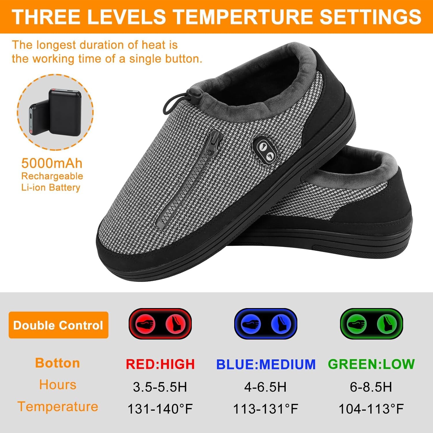 Les chaussons sont équipés de deux batteries lithium-ion polymère de 5 000 mAh, offrant une autonomie allant jusqu'à 8,5 heures. La durée de vie de la batterie varie selon la qualité, assurant une chaleur durable pendant de longues périodes.