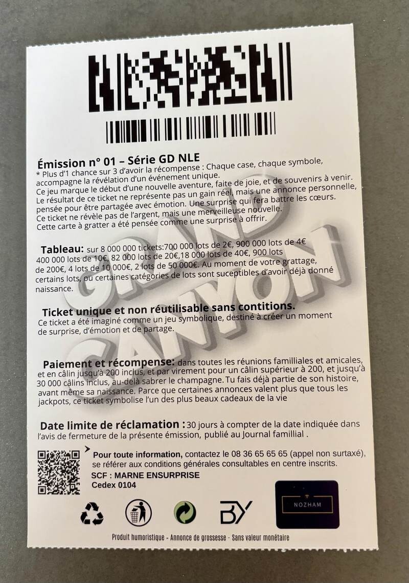 Le principe est simple : vous offrez le ticket comme un petit jeu à gratter. La personne découvre les symboles un à un jusqu’à révéler le message final : « Nous attendons un bébé ». L’effet de surprise fonctionne toujours très bien et transforme l’annonce en un moment inoubliable.